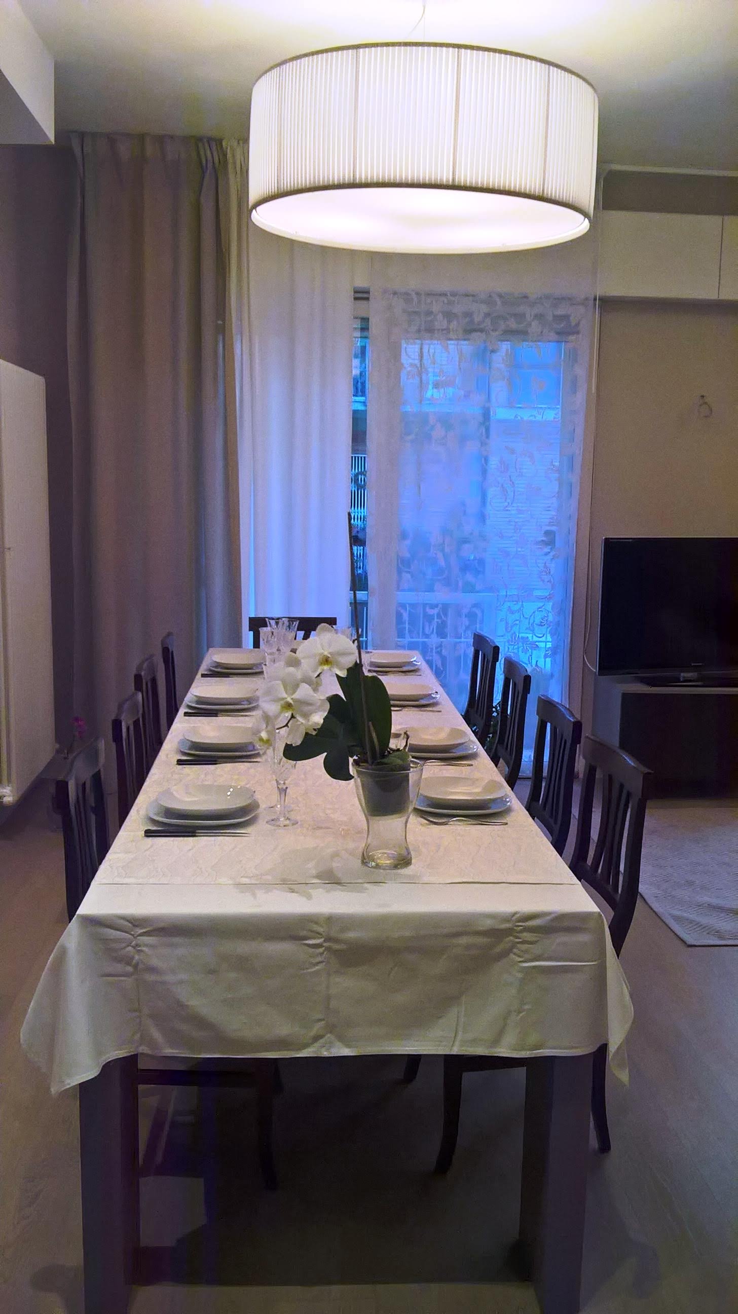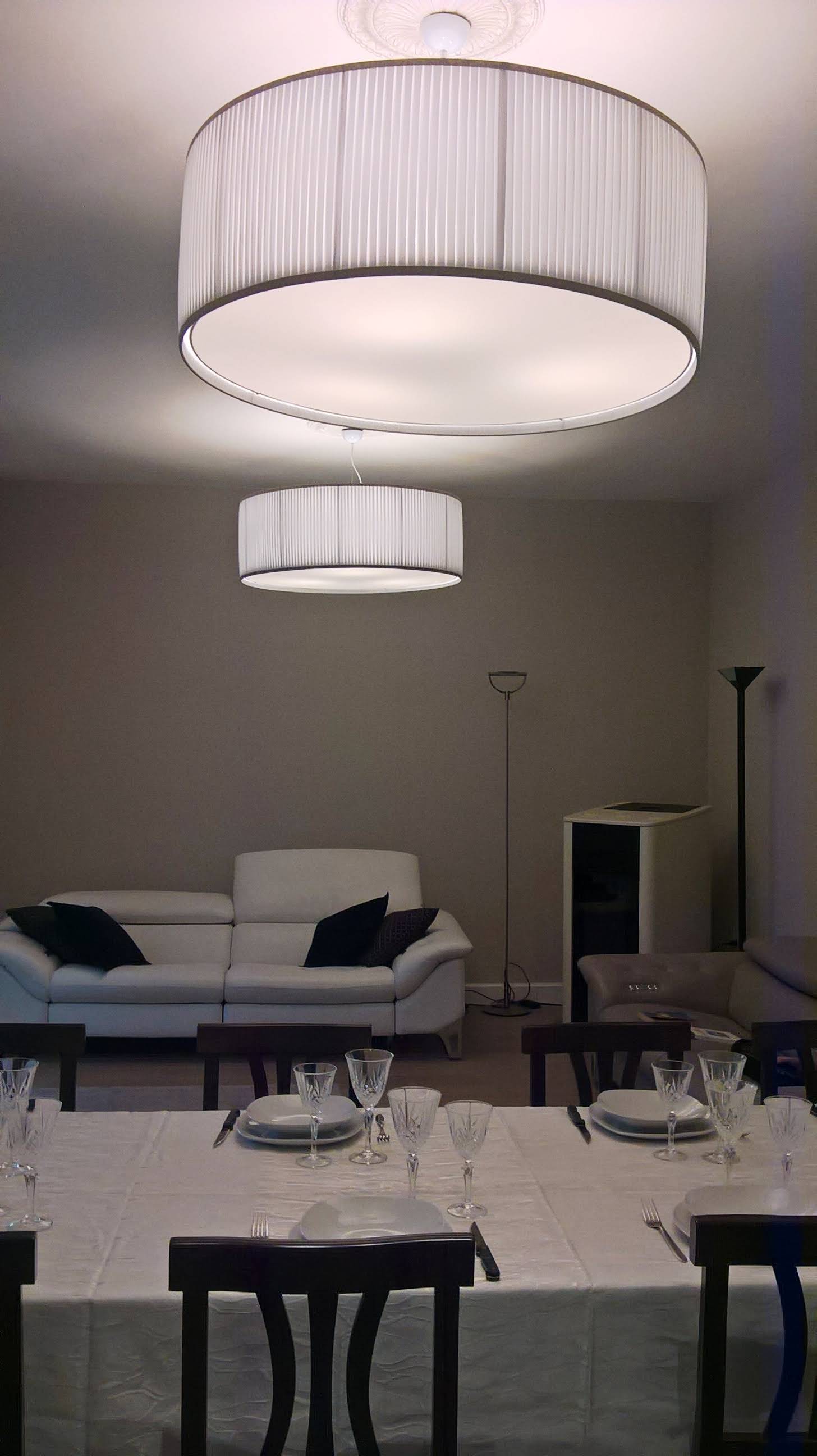 Sospensioni cilindriche in tessuto pongè con diffusore inferiore in Plexiglas® opalino realizzate per una casa privata a Rimini