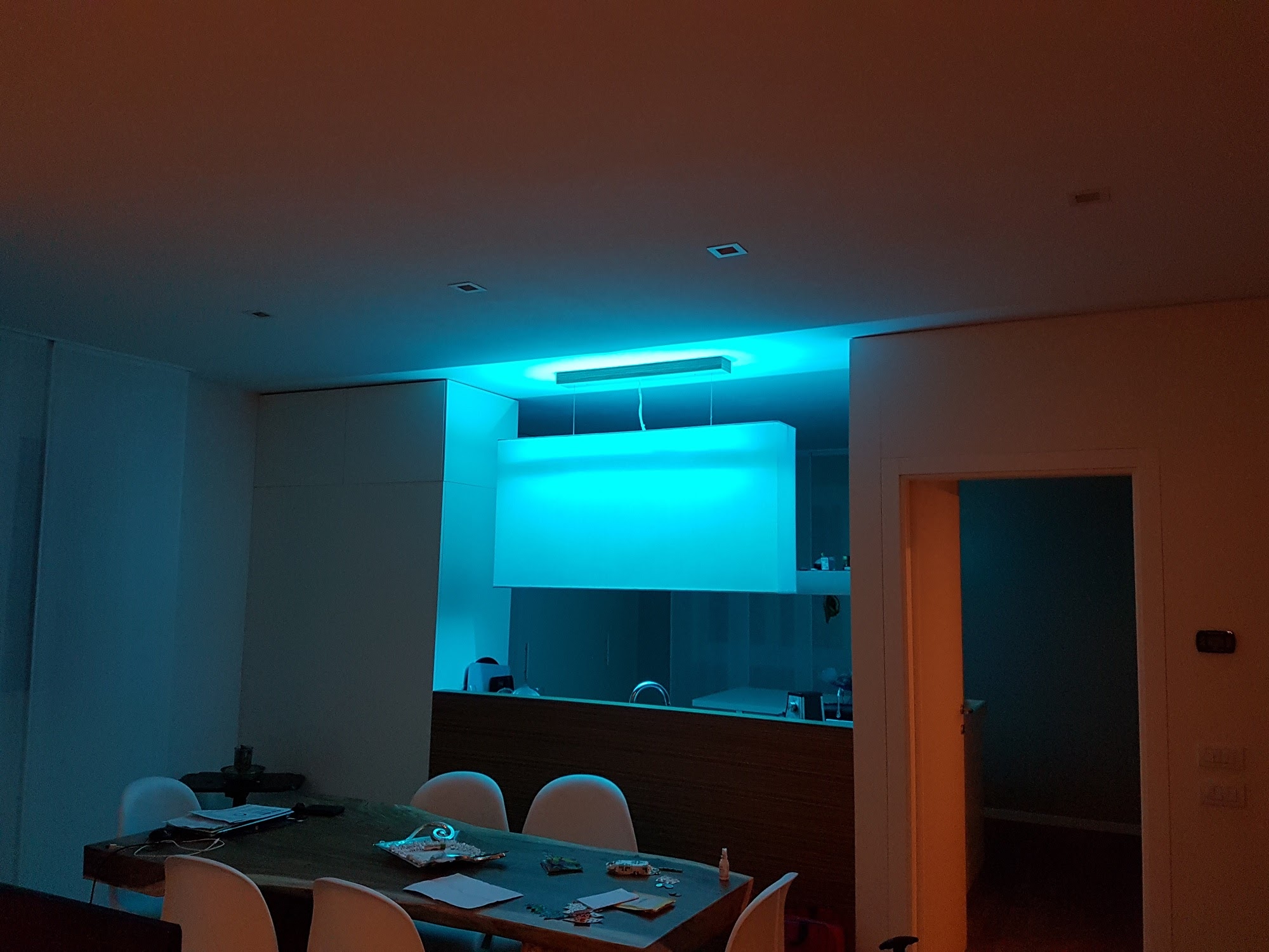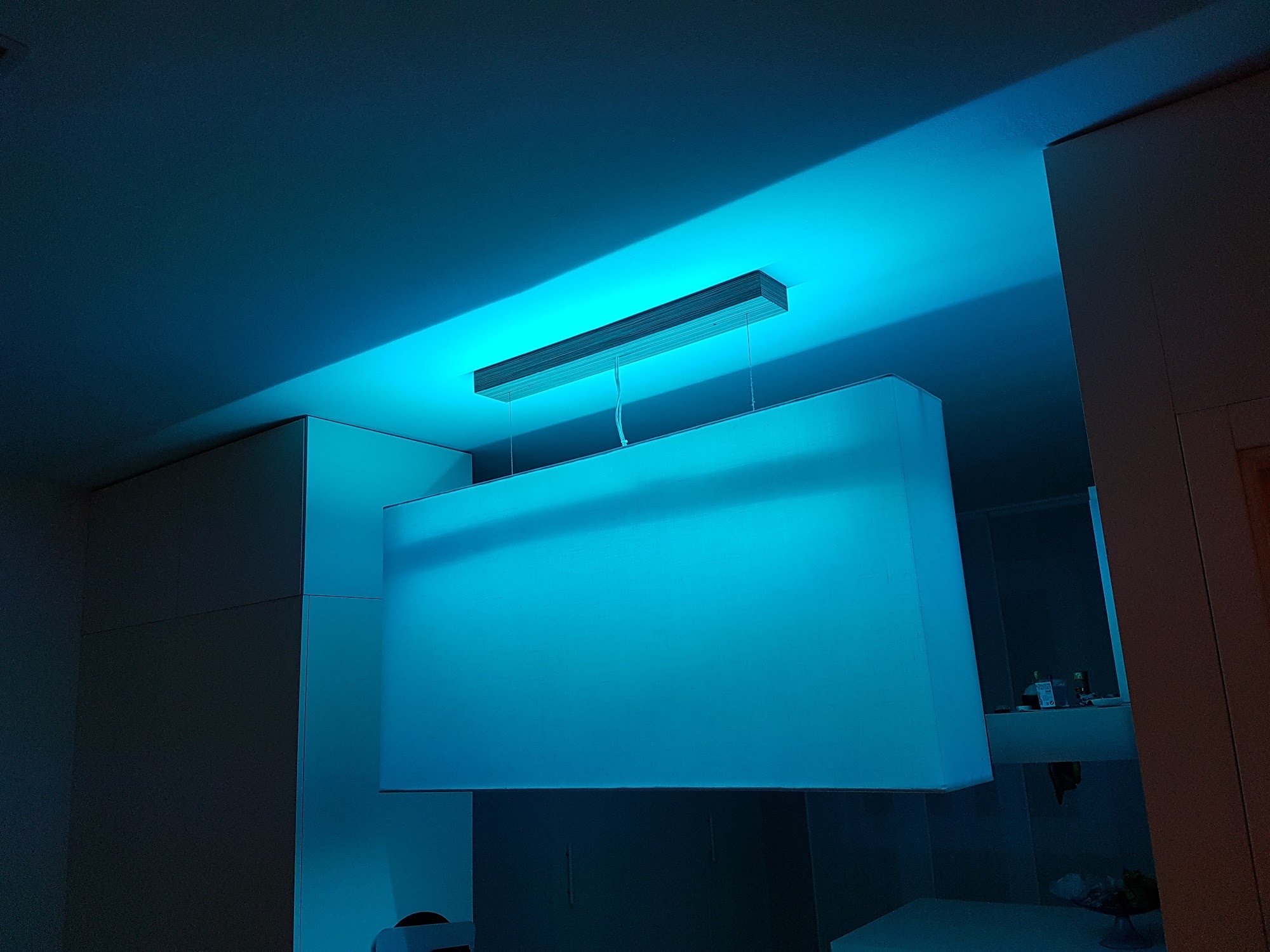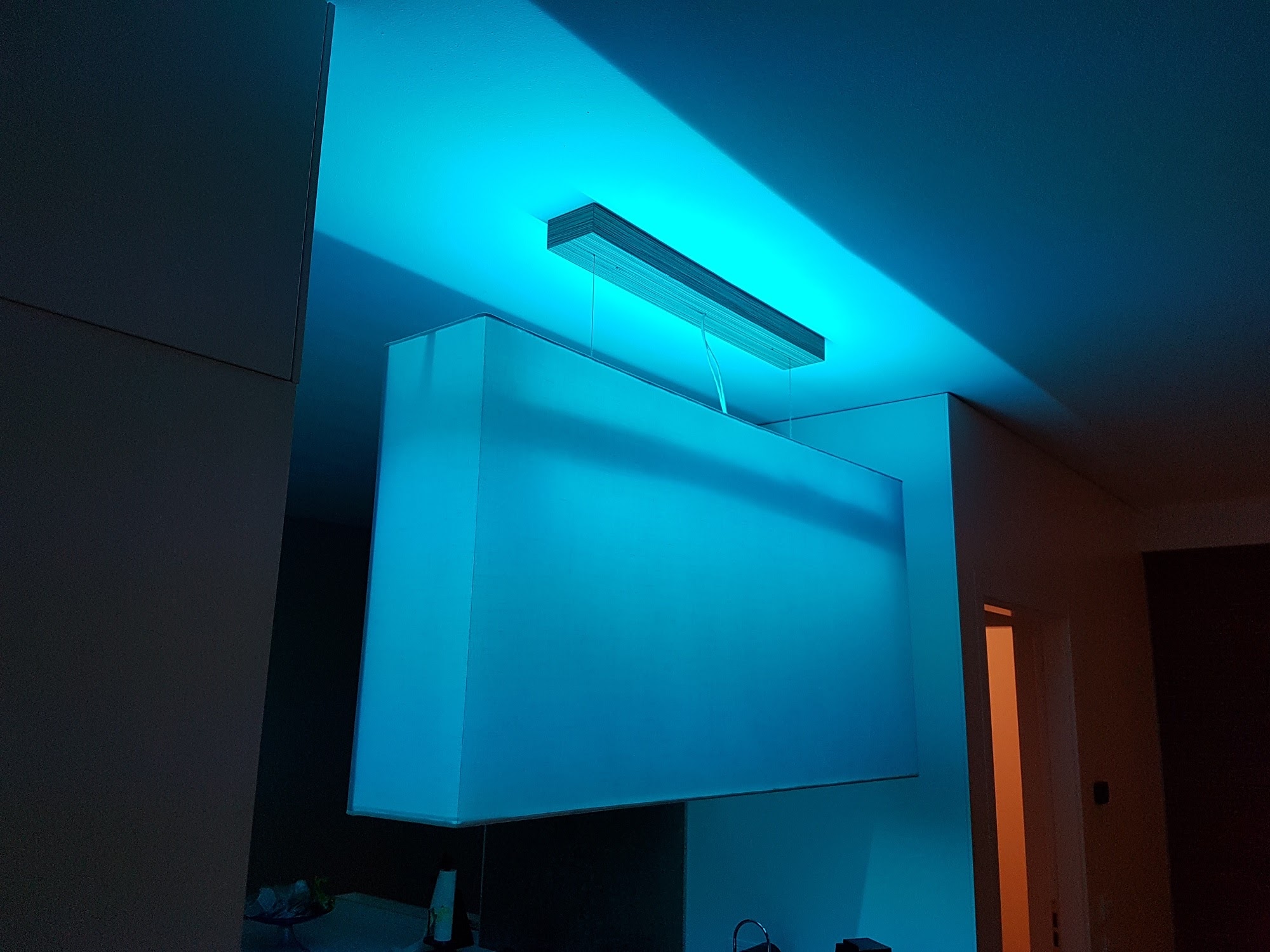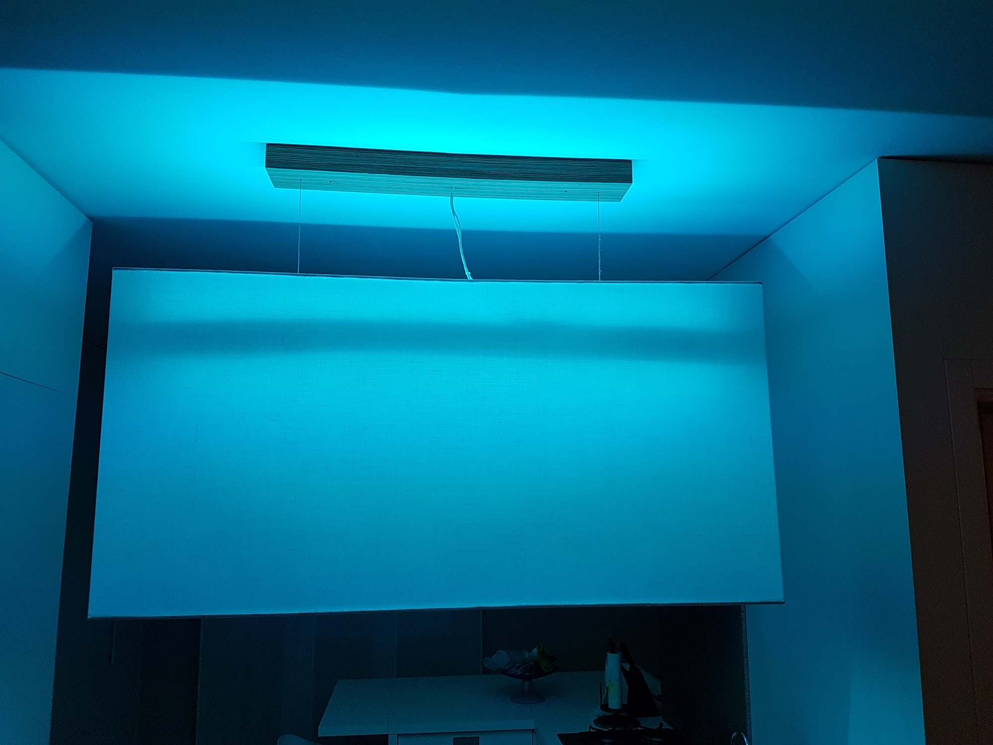 Sospensione paralume rettangolare di larghezza 1,5 metri in tessuto lino con illuminazione interna LED per cromoterapia.