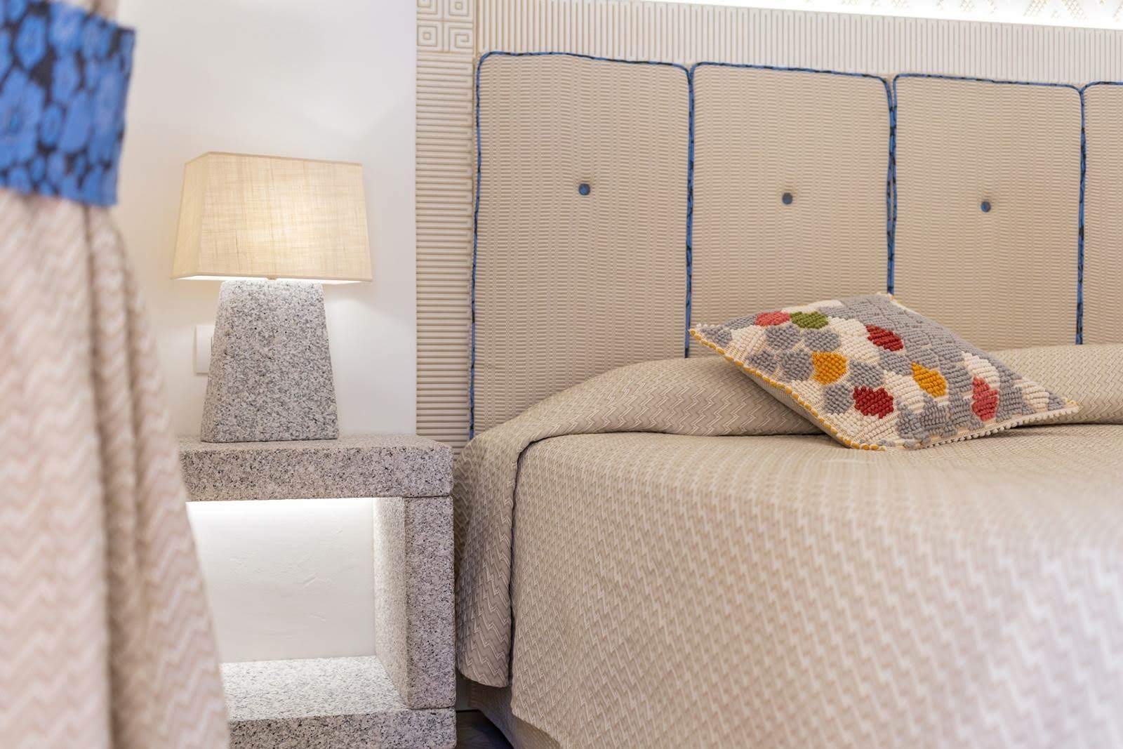 Paralumi parallelepipedo e piramide rettangolare in tessuto juta chiara realizzati per l'Hotel Corte Bianca a Cardedu