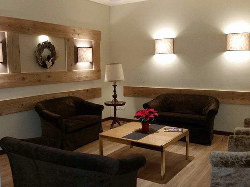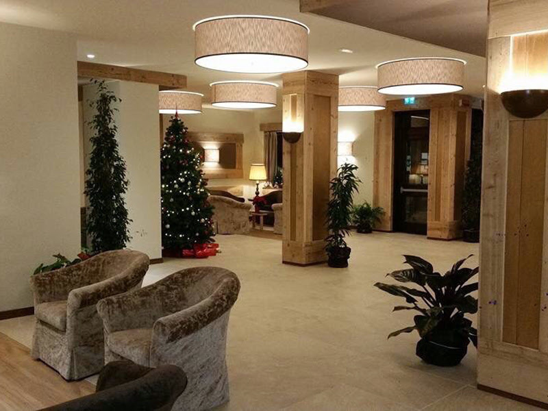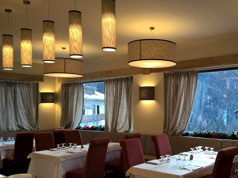 Plafoniere paralume cilindro con diffusore in Plexiglas® opalino ed applique 1/2 cilindro in tessuto per Hotel a Selva di Cadore.