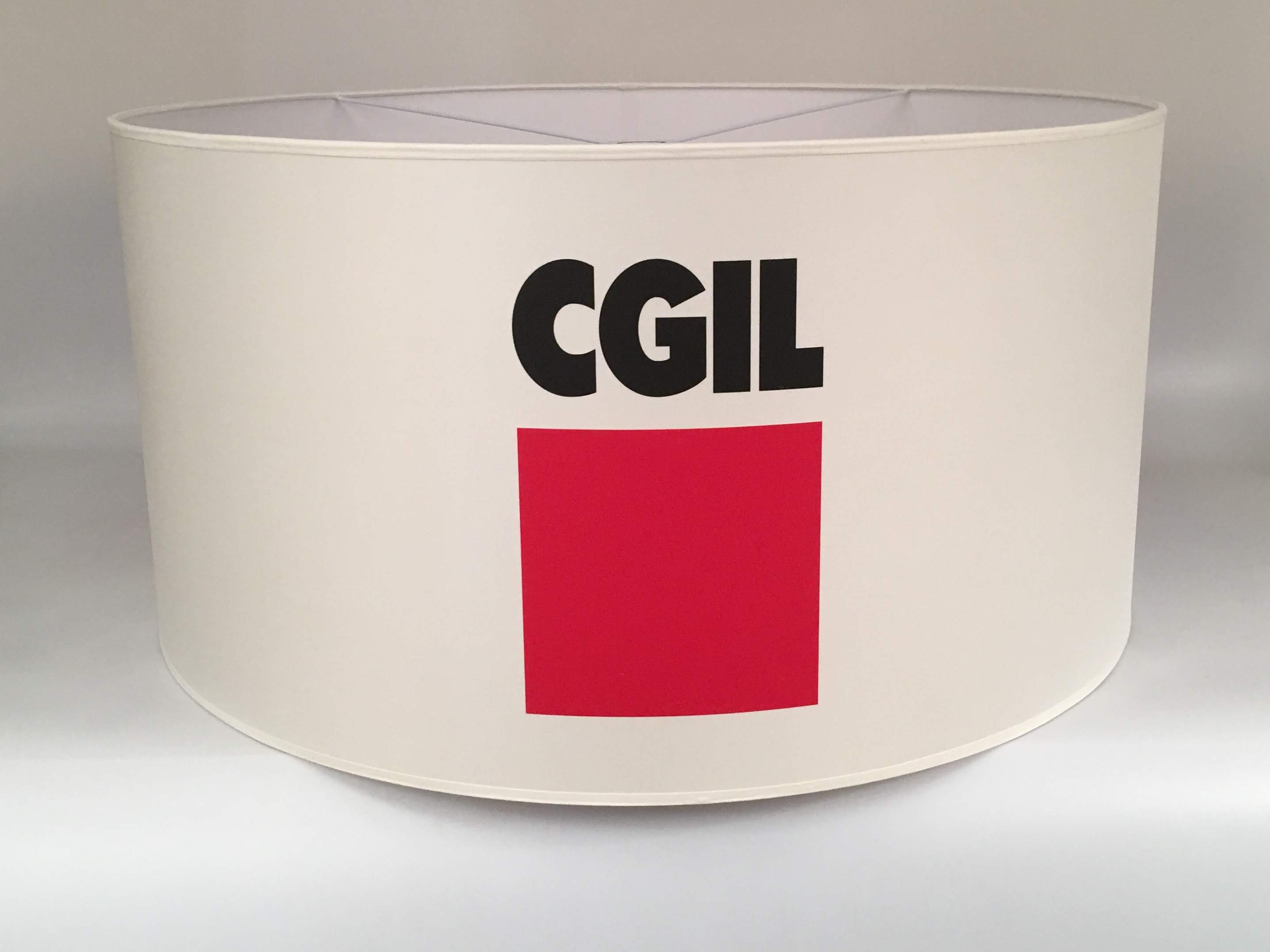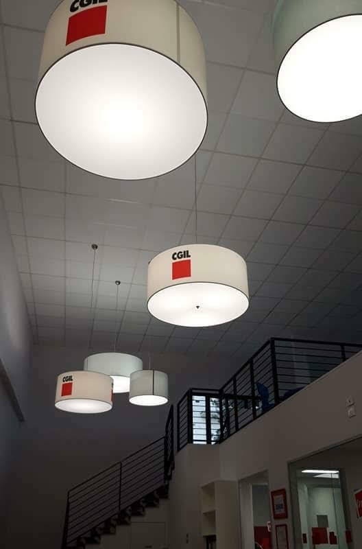 Sospensioni complete a cilindro di varie dimensioni in tessuto stampato e con diffusore in Plexiglas per la CGIL di Firenze