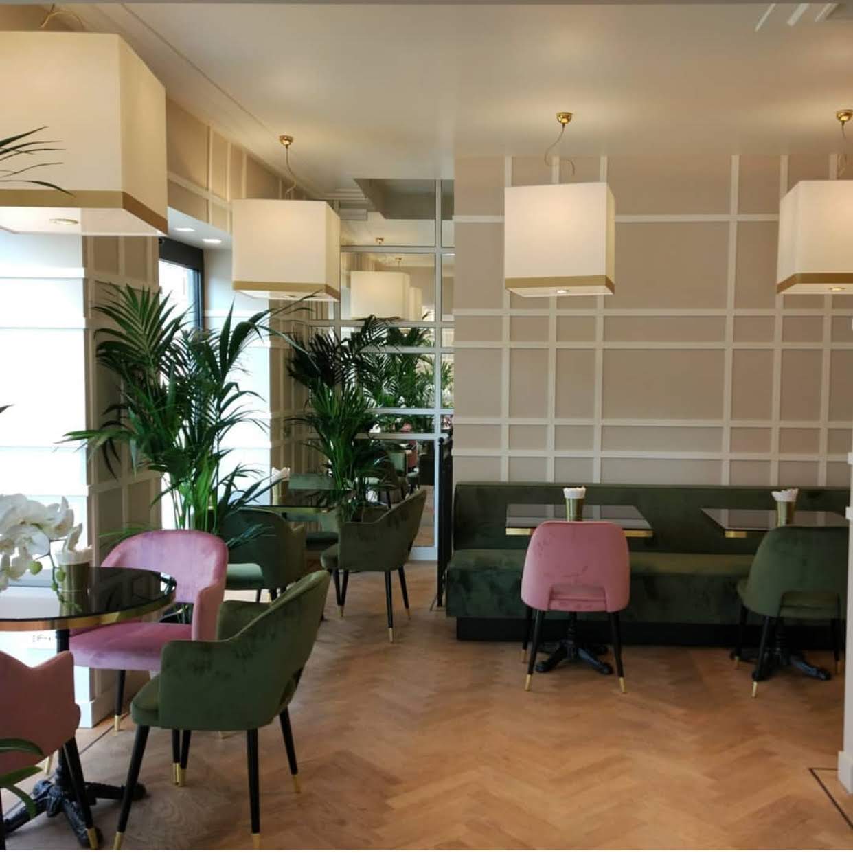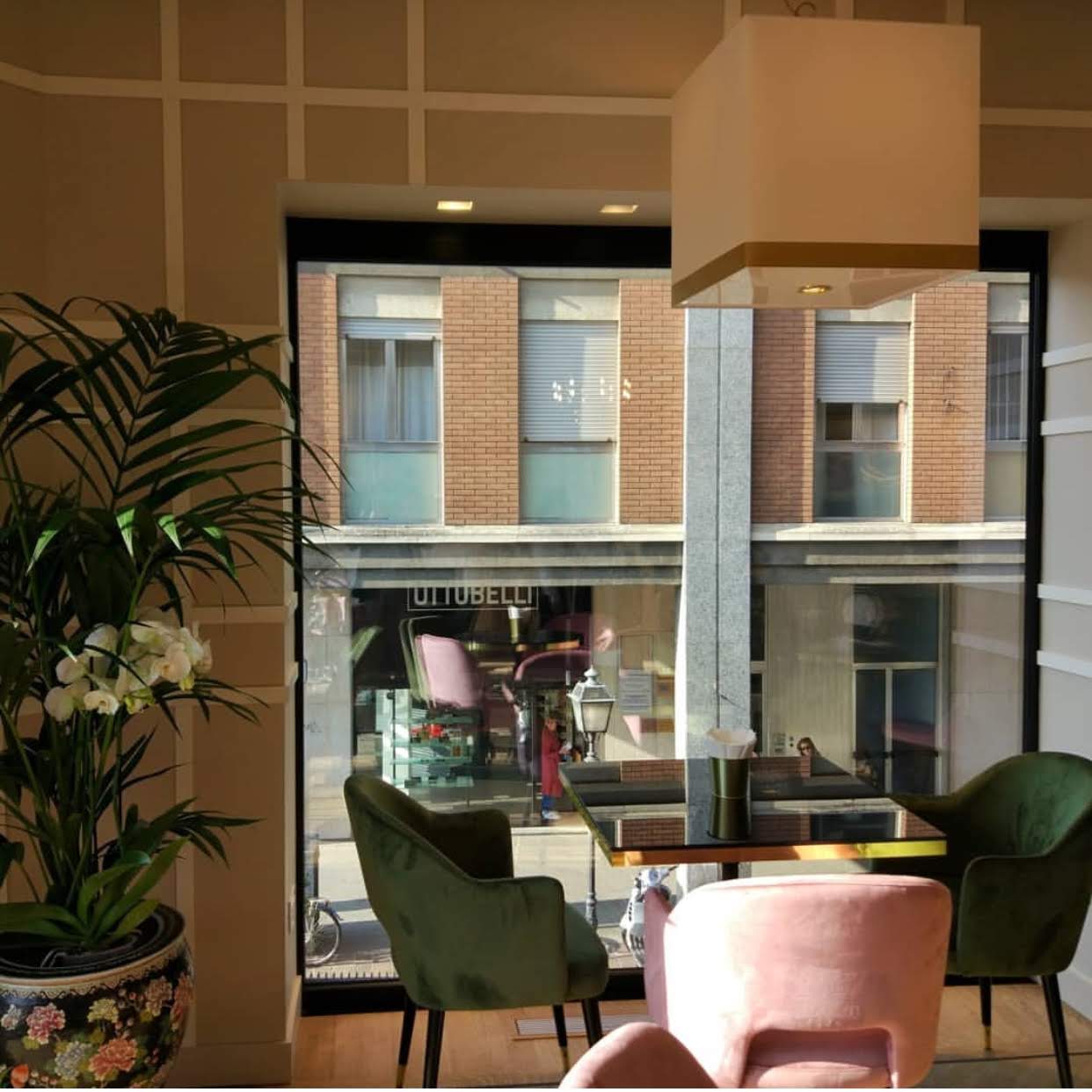 Sospensioni quadre con fascia oro e faretto inferiore per luce diretta, realizzate per la Pasticceria Signorelli di Alessandria