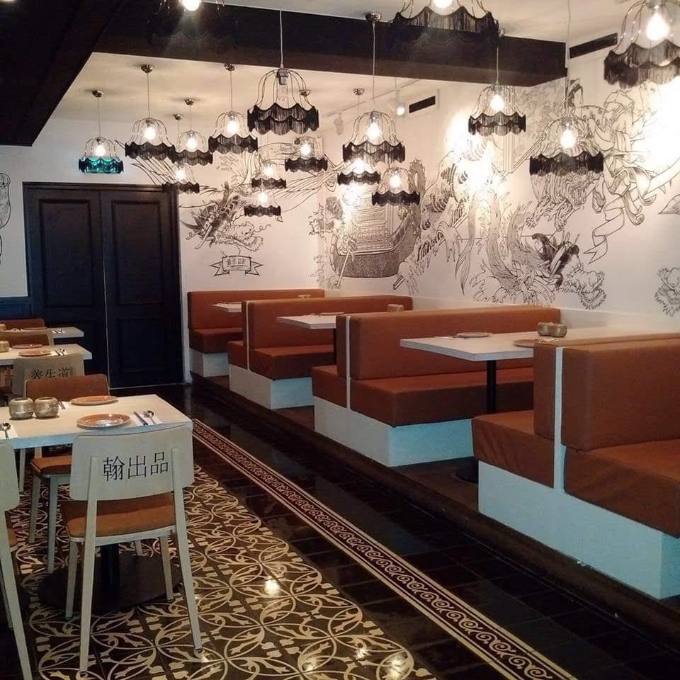 Sospensioni con telaio paralume tulipano vintage in ferro verniciato nero con frangia per Ristorante Umami in Olanda.